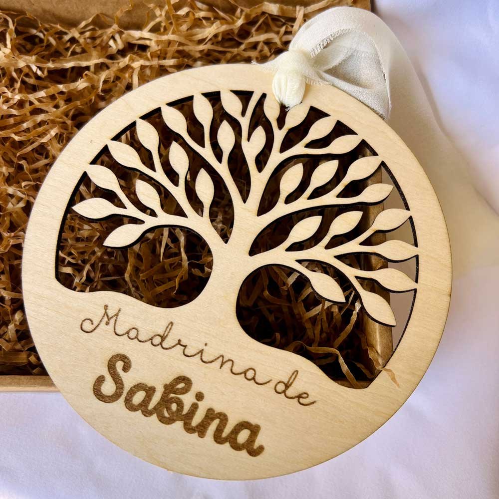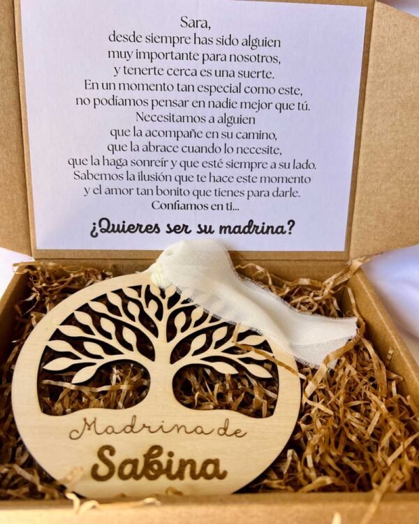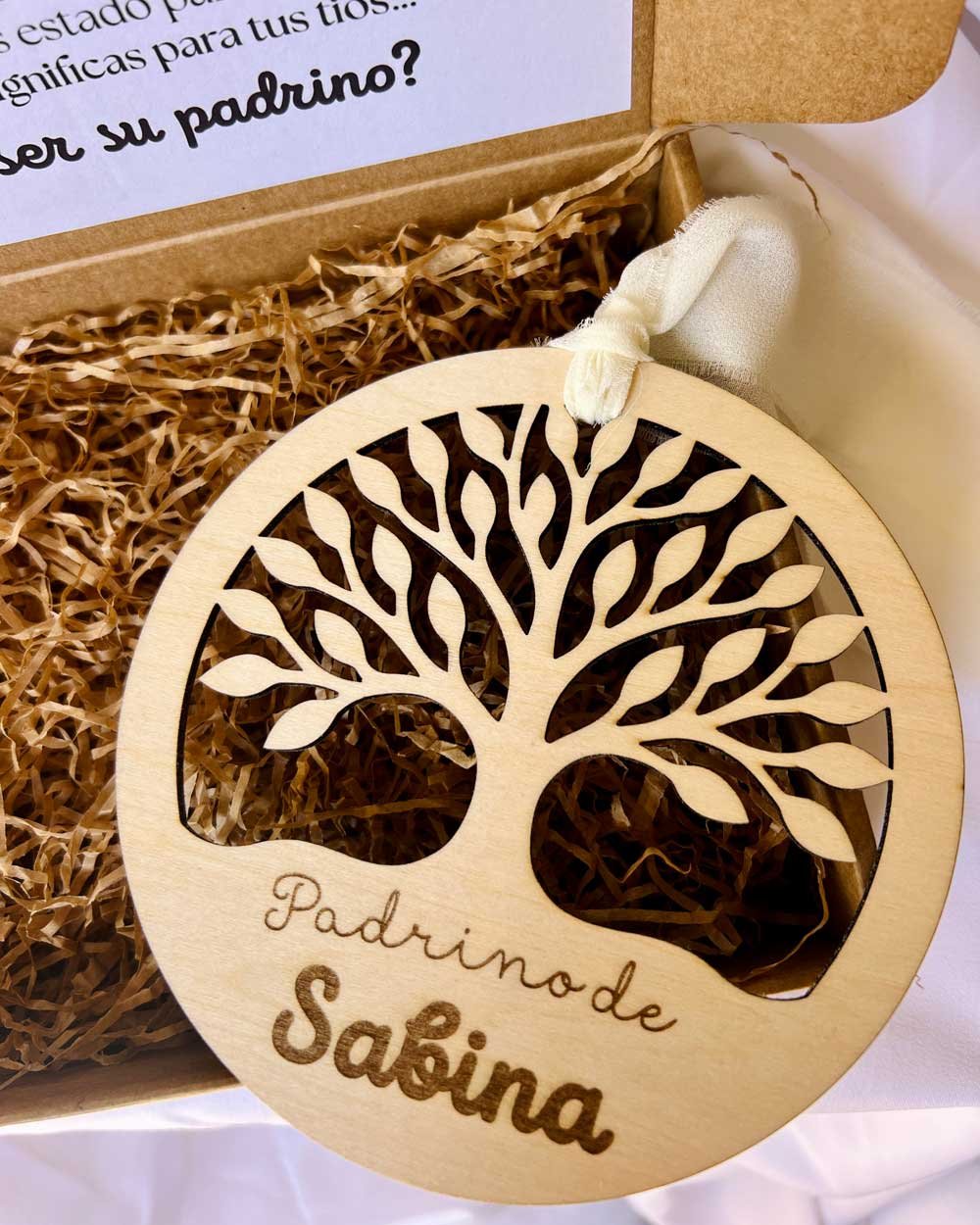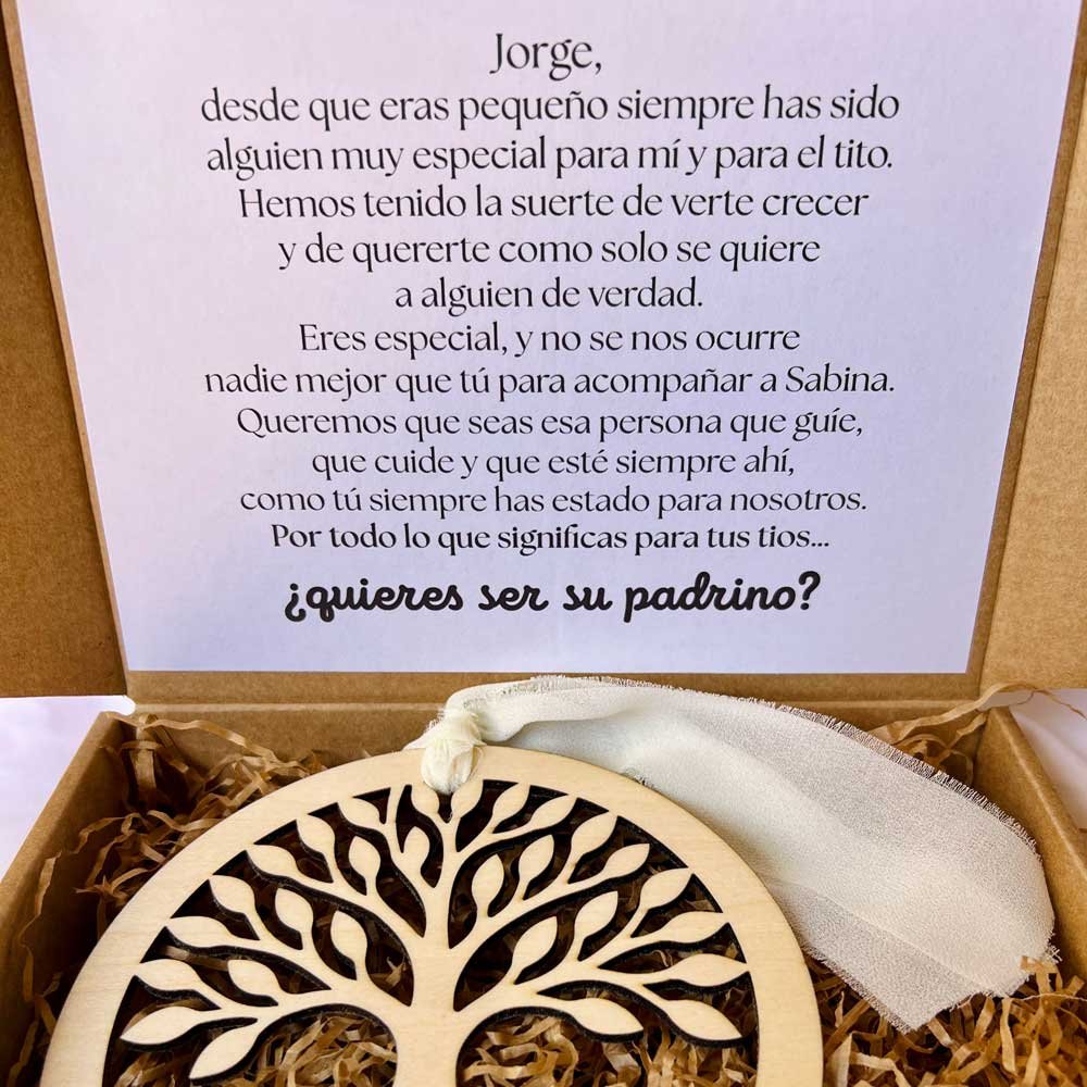 Haz único tu regalo para el padrino o la madrina con este detalle personalizado. Elegir a la madrina o al padrino es un momento cargado de emoción. Nuestra cajita personalizada está diseñada para hacerlo aún más especial. En su interior encontrarás un precioso árbol de la vida de madera grabado y cortado a láser, elaborado en nuestro propio taller, con una dedicatoria personalizada. Además, podrás personalizar el árbol de la vida con el nombre del niño/a para que sea un regalo único e irrepetible. Este detalle no solo es un regalo, sino una experiencia inolvidable que quedará para siempre en la memoria de quienes lo reciban. ¿Quieres ver otros modelos de cajitas de petición personalizada para padrinos? Te recomendamos nuestra caja quieres ser mi padrino de bautizo.