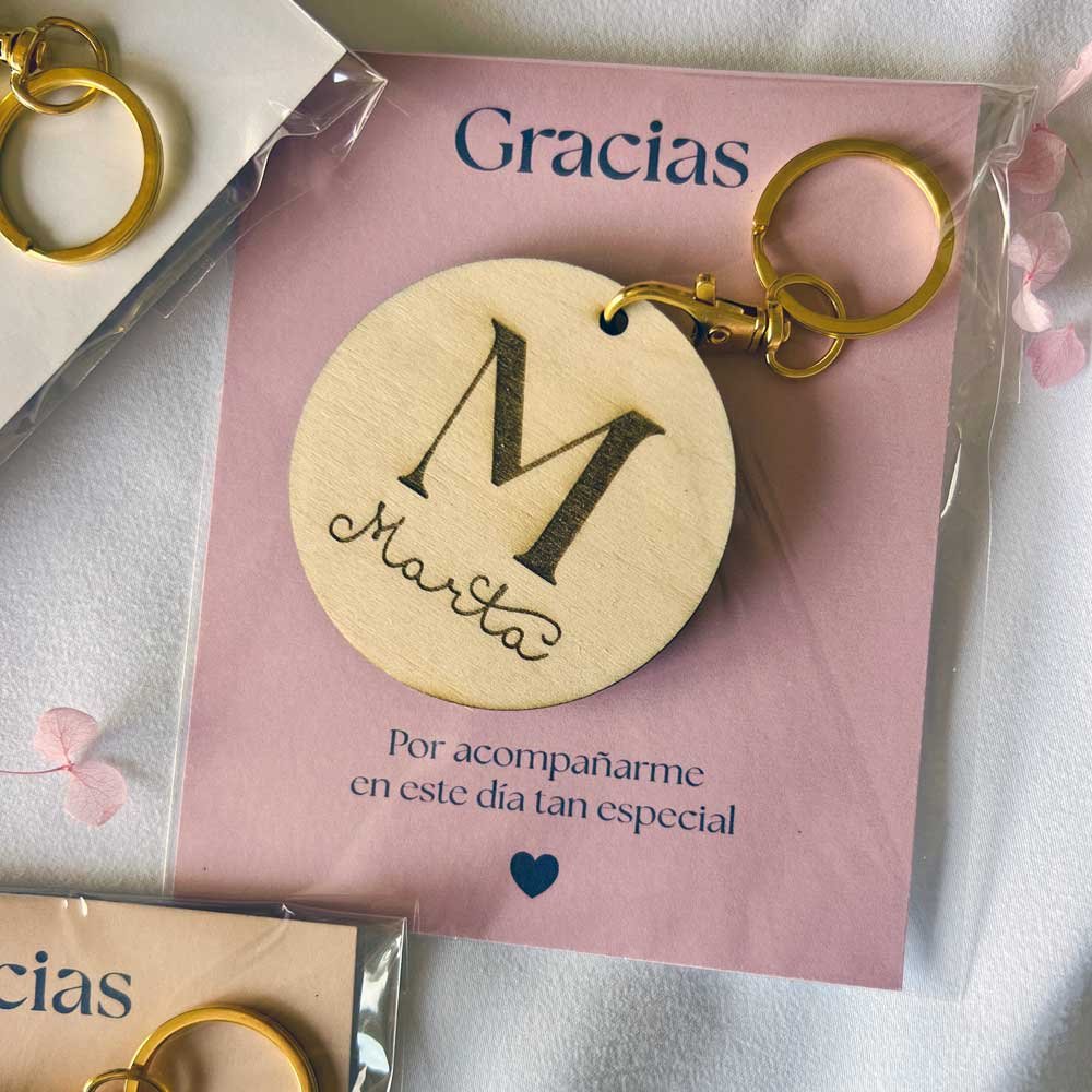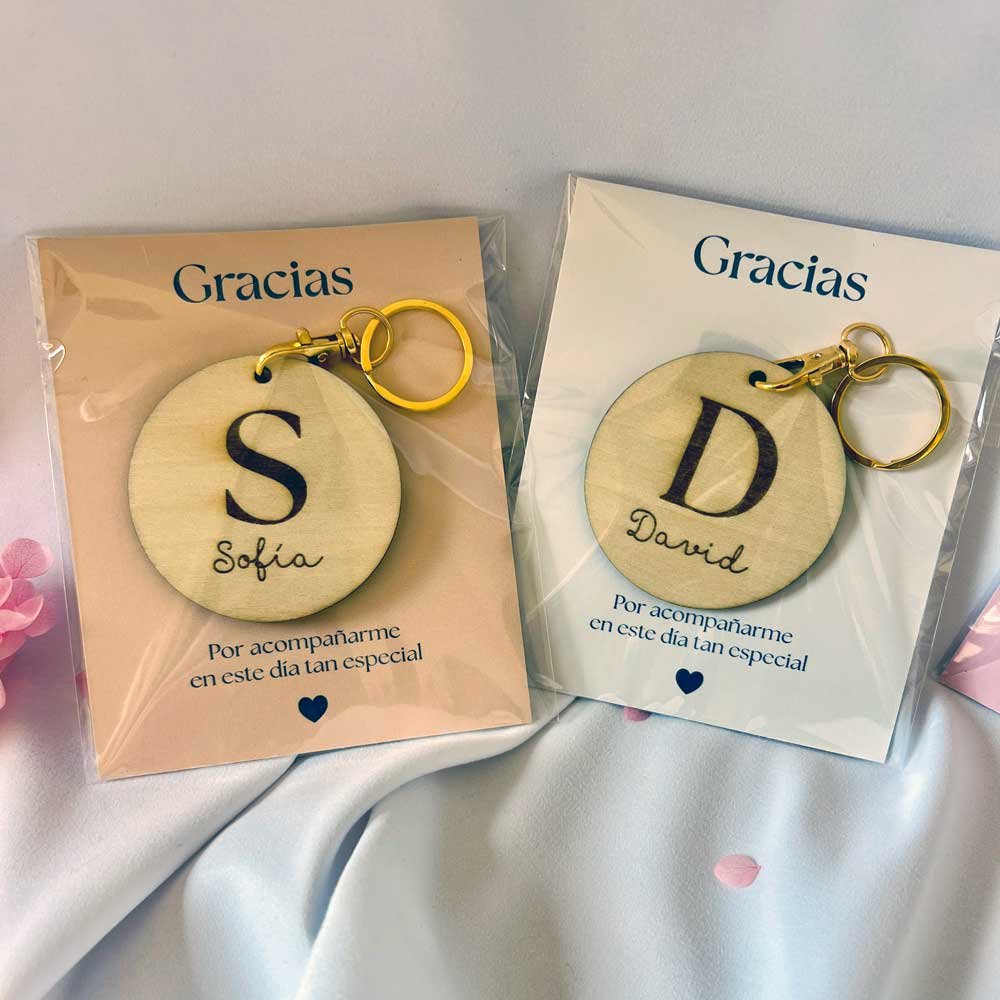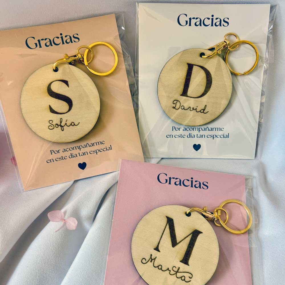 Un detalle que tus invitados realmente conservarán. Nuestros llaveros de madera natural combinan la elegancia del grabado a láser con un diseño de inicial y nombre totalmente personalizado. Son el recuerdo ideal para bautizos, bodas o cualquier evento especial donde quieras dar las gracias de una forma única y artesanal.