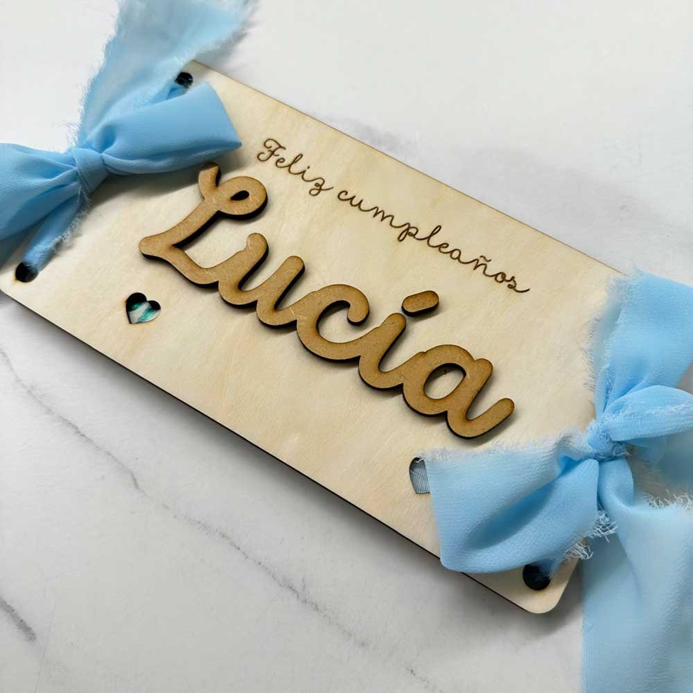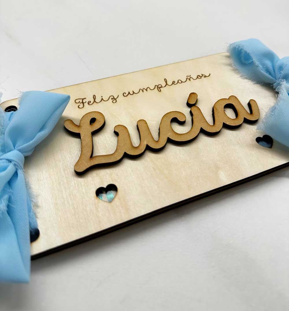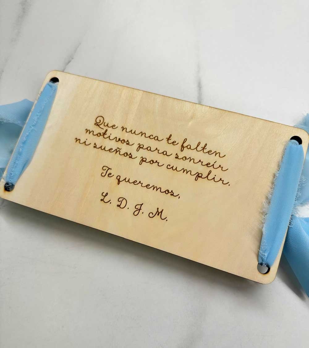 Hacemos a mano en nuestro taller los porta billetes personalizados nacimiento utilizando madera natural con certificación FSC y MDF para el nombre en relieve. Nos parece una combinación perfecta por el bonito contraste que se crea entre los dos materiales. Podrás elegir el color del lazo que más te guste para el sobre de madera.